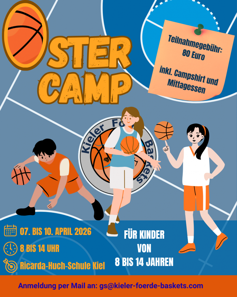 Unser beliebtes Ostercamp steht wieder an. An den vier Tagen nach Ostern können wieder 8-14 Jährige ihre Basketball-Skills bei uns verbessern. Egal ob Anfänger:innen oder Fortgeschrittene. Alle sind willkommen! Meldet euch jetzt mit dem Anmeldeformular an bei gs@kieler-foerde-baskets.com.